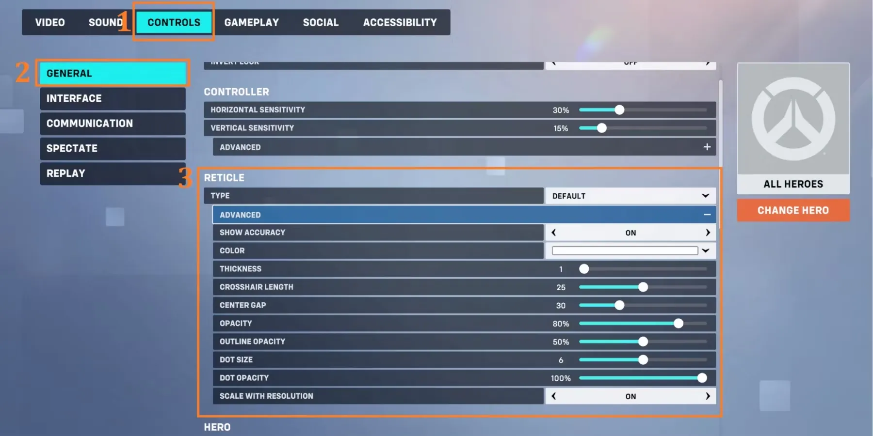 Это изменение можно сделать сразу после выбора героя или на переднем экране. Откройте меню, нажмите опции, затем перейдите на вкладку управления. На первой странице этой общей вкладки находятся опции прицела. Игроки могут свободно вносить простые изменения в дизайн или продвинутые пользовательские решения.