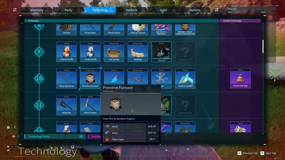 Примитивная печь - предмет, который вы должны разблокировать за очки технологий после достижения 10-го уровня. Для ее постройки требуется 20 дерева, 50 камня и десять огненных органов - последние можно получить, победив или поймав огненных зверушек, в частности Фокспарков и Руби.