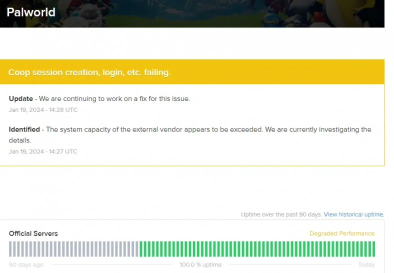 Официальная страница состояния сервера Palworld отображает состояние сети в реальном времени, а также все активные уведомления об инцидентах, связанные с ограничением пропускной способности.