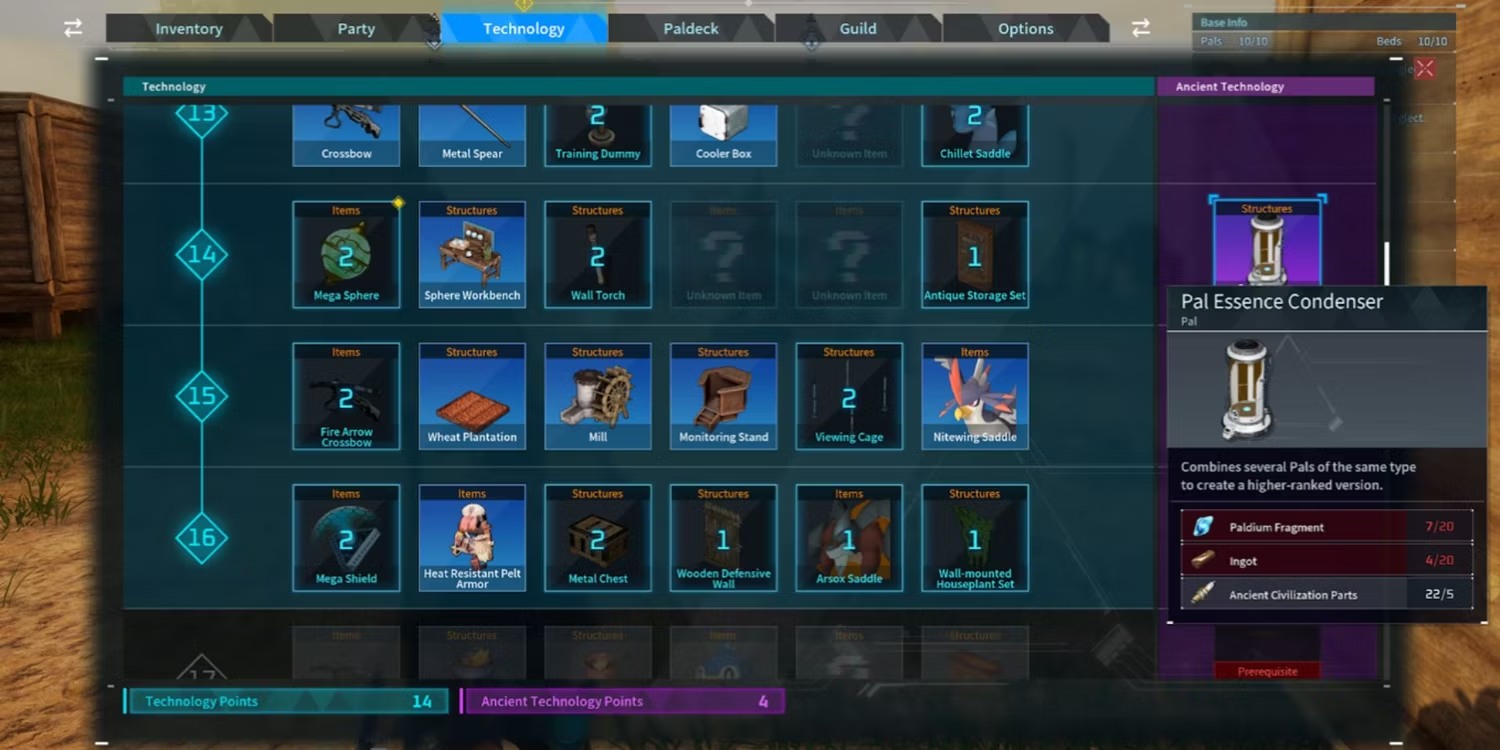 Прежде чем вы сможете конденсировать пала в Palworld, вам необходимо разблокировать и построить конденсатор эссенции палов. Доступ к этой технологии открывается на вкладке "Древние технологии" после достижения 14-го уровня. Но чтобы разблокировать это сооружение, игрокам также потребуется 2 очка Древней технологии. Выполнив эти требования, вы также должны построить Конденсатор эссенции Пала, потратив следующие материалы: