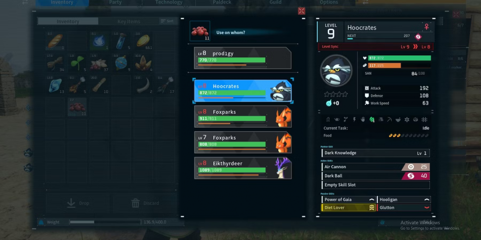 Чтобы накормить приятелей из инвентаря, вам нужно собрать в инвентаре предметы питания. Когда вы соберете достаточно еды, откройте инвентарь, наведите курсор на предмет и щелкните правой кнопкой мыши, чтобы использовать его. Появится меню, в котором вы можете выбрать пала из вашей партии, которого хотите накормить. Но помните, что этим способом нельзя накормить питомцев на вашей базе или в коробке, только питомцев из вашей партии.