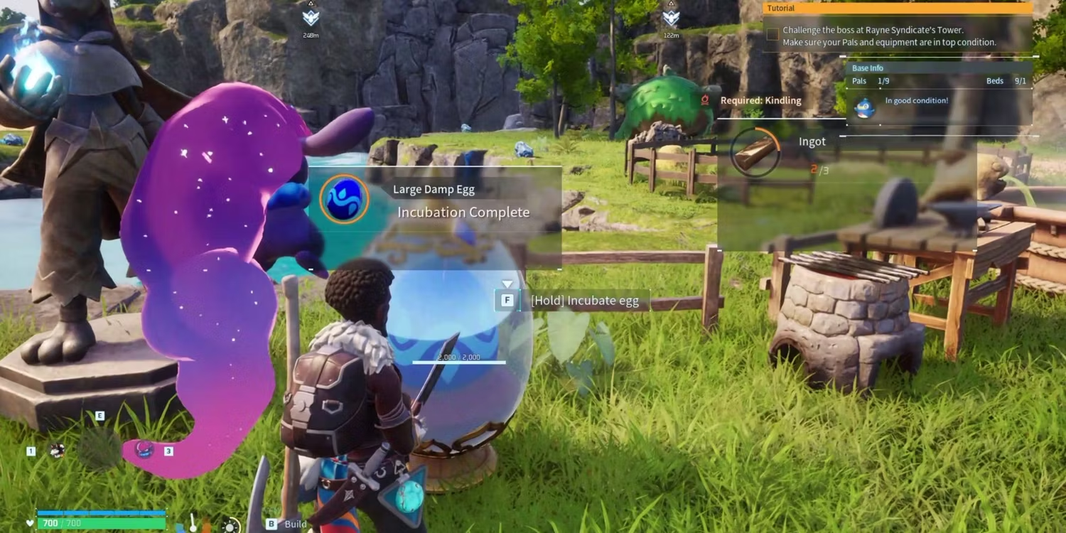 Как только постройка будет завершена, вы сможете использовать Инкубатор яиц. Взаимодействуйте со строением, и вы увидите интерфейс меню, в котором есть только один слот. Этот слот предназначен для яйца, которое вы хотите высидеть, поэтому просто поместите в него большое сырое яйцо. Остальное очень просто: Подождите 40 минут, пока яйцо закончит инкубацию, и снова взаимодействуйте с Инкубатором яиц, чтобы вывести нового Пала. В нашем случае это был Пенкинг.