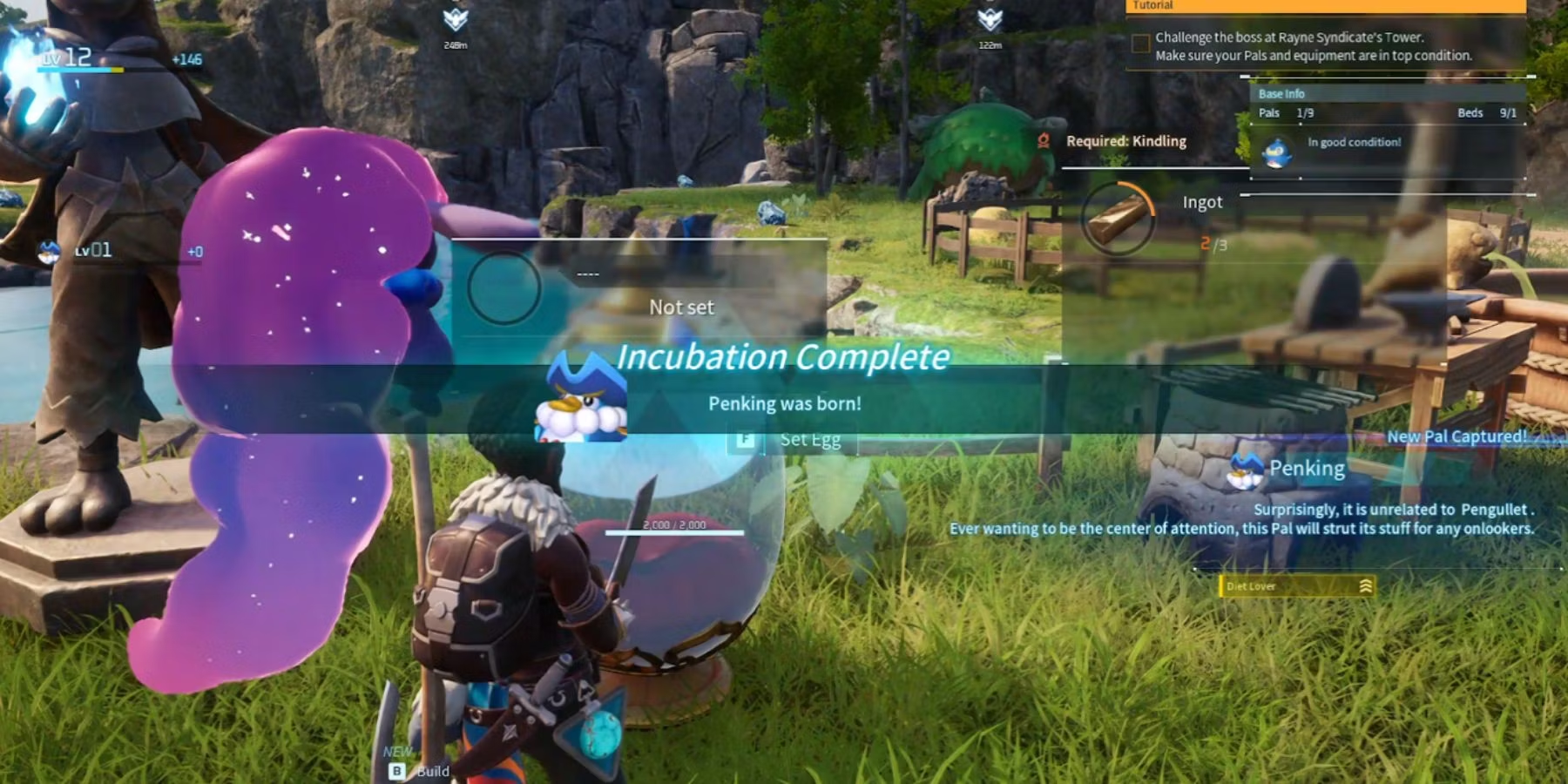 Альтернативный вариант для абсолютных новичков - искать большое сырое яйцо. В нашем случае мы получили первого Пенкинга таким образом в ранней игре. Если у вас недостаточно высокий уровень или нет подходящего оружия для победы над боссом, этот вариант вам подойдет. Когда большое сырое яйцо будет найдено, поместите его в Инкубатор яиц и подождите 40 минут. После этого вылупите яйцо, и, возможно, пал, который родится из него, будет Пенкингом.