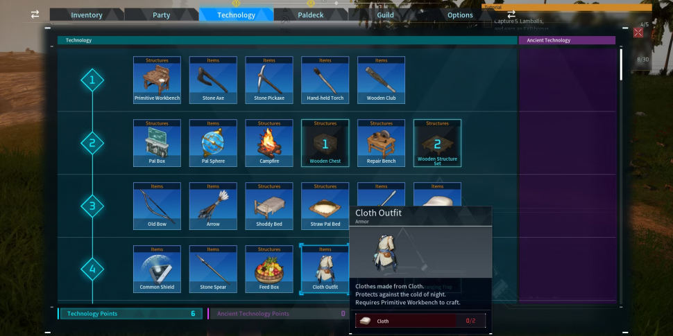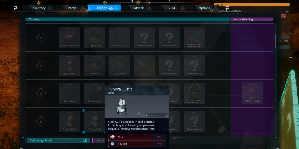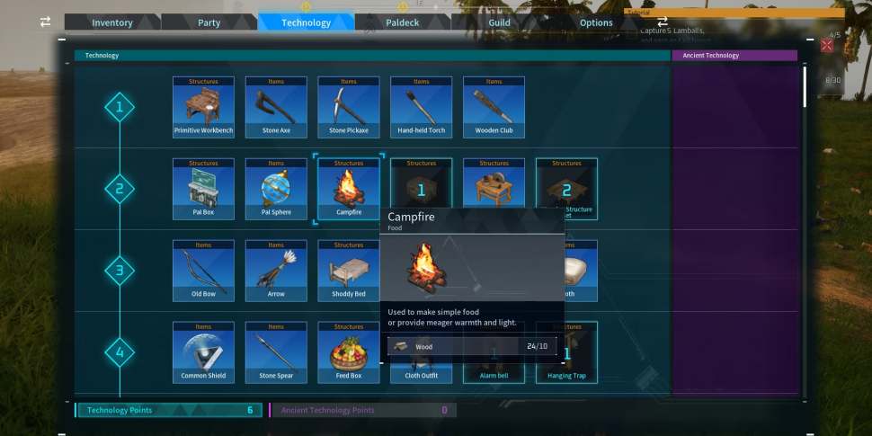 Начав свое приключение по Палворлду, вы заметите, что здесь есть множество различных зданий и предметов, которые можно создавать. Немного поискав дерево и камень, вы сможете посетить раздел "Технологии" в главном меню. Здесь вы сможете открыть новые рецепты, среди которых есть и такие, которые помогут вам согреться:
