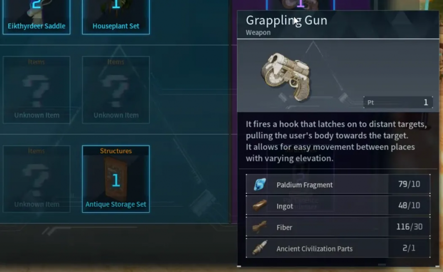 - Потратьте 1 очко Древней технологии, чтобы разблокировать схему "Абордажный пистолет" в дереве технологий в Палворлде.