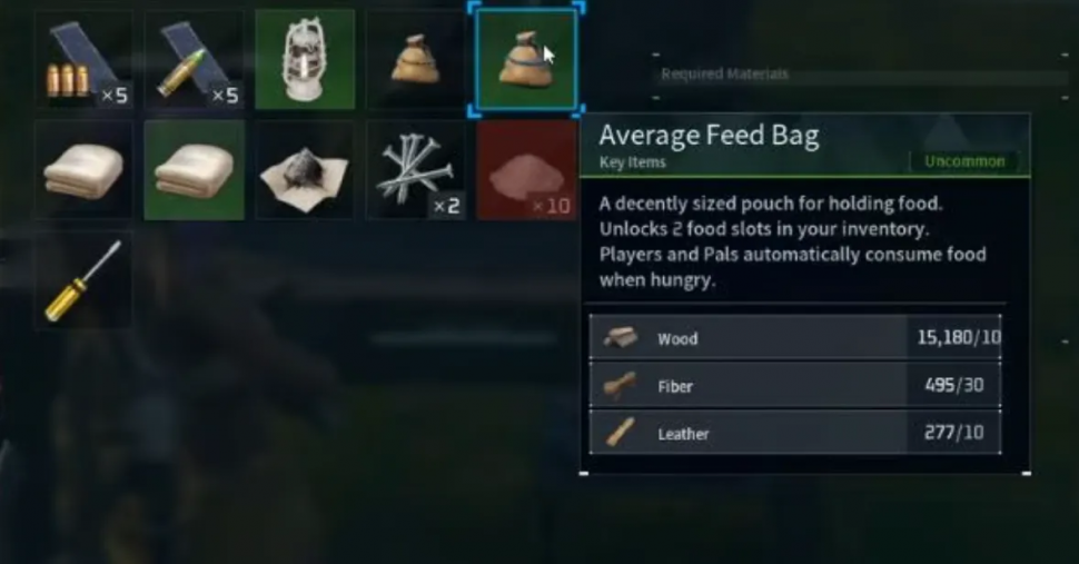 Узнав рецепт, соберите базовые ингредиенты, такие как волокно и древесина, чтобы начать конструировать мешки для корма на любом верстаке. Для больших мешков требуются более редкие материалы в больших количествах. Необходимое количество увеличивается с ростом размера мешка: