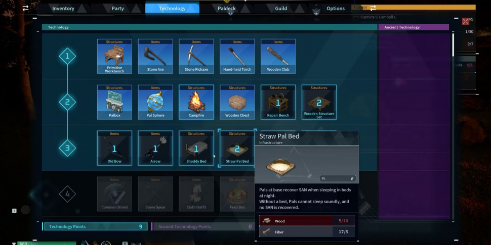 Во-первых, вам нужно разблокировать отдельные кровати для себя и своих друзей. Для этого откройте свой инвентарь и перейдите на вкладку "Технологии". Здесь обратите внимание на предметы в 3 разделах, среди которых должны быть Shoddy Bed и Straw Pal Bed. Вам нужно будет разблокировать их с помощью Очков Технологии, которые стоят 3 за обе кровати. Кроме того, купите набор деревянных конструкций, который находится во 2-й секции, потому что он пригодится вам позже.