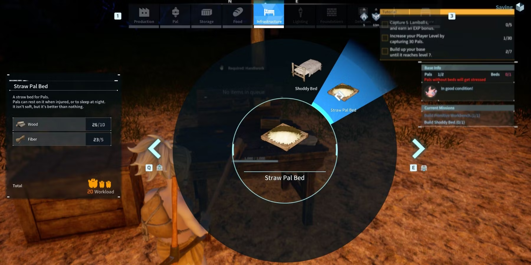 Для этого просто откройте колесо строительства и перейдите на вкладку "Инфраструктура". Здесь вам нужно выбрать рецепт "Кровать из соломы" и выбрать место для ее строительства. Стоит отметить, что кроватей должно быть столько, сколько прирученных вами питомцев. В противном случае питомцы без места для сна будут испытывать стресс, который может привести даже к смерти, поэтому позаботьтесь о том, чтобы всем хватило места.