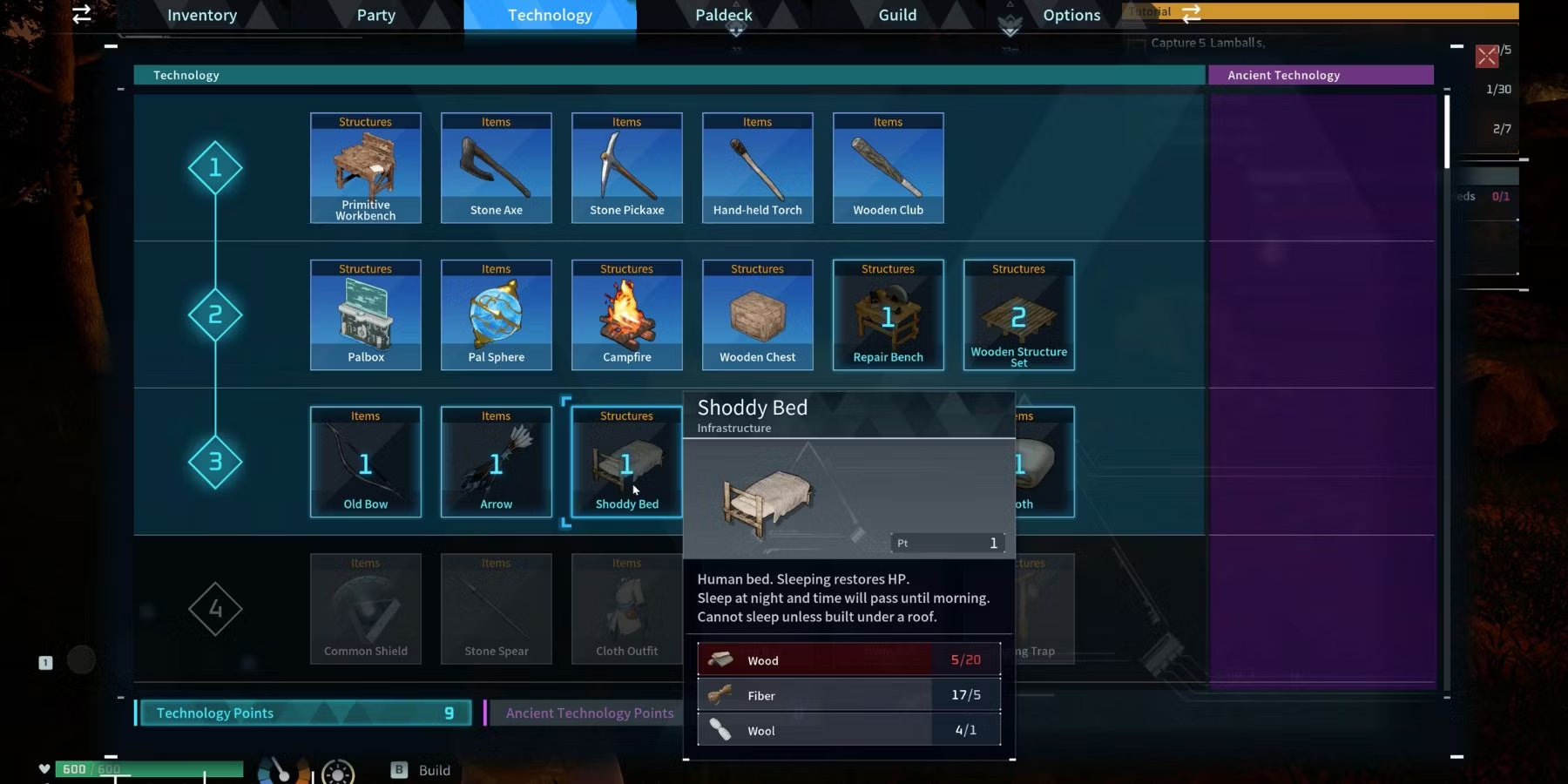 Во-первых, вам нужно разблокировать отдельные кровати для себя и своих друзей. Для этого откройте свой инвентарь и перейдите на вкладку "Технологии". Здесь обратите внимание на предметы в 3 разделах, среди которых должны быть Shoddy Bed и Straw Pal Bed. Вам нужно будет разблокировать их с помощью Очков Технологии, которые стоят 3 за обе кровати. Кроме того, купите набор деревянных конструкций, который находится во 2-й секции, потому что он пригодится вам позже.