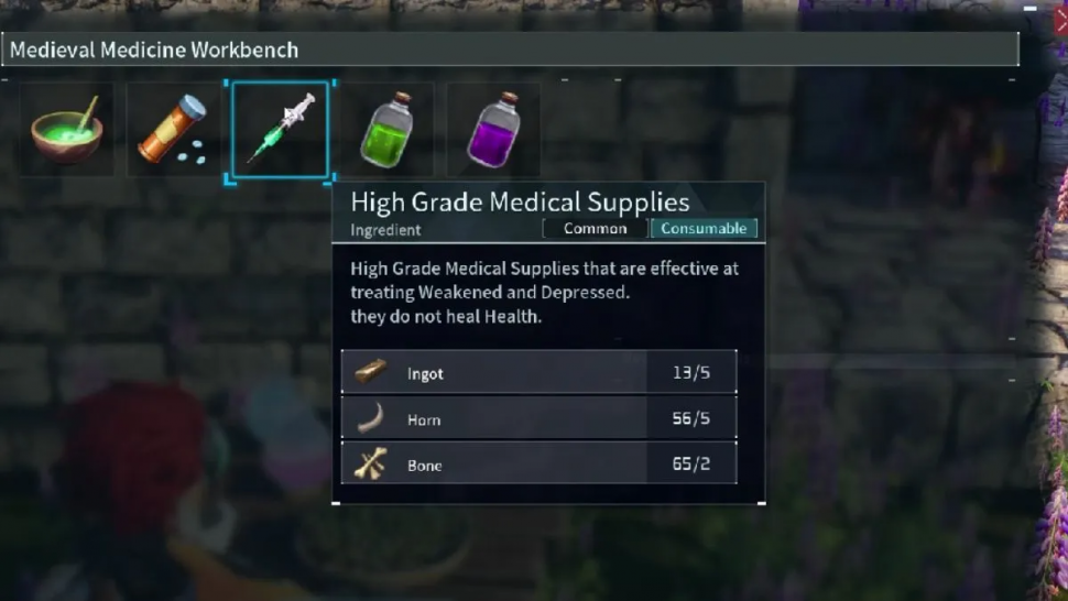 Для приготовления партии необходимо собрать 2 кости, 5 рогов и 5 слитков, чтобы смешать их на Аптекарской станции. Затем накормите отчаявшегося пациента готовыми пилюлями через меню колеса "Дать предмет" и наблюдайте за скорым выздоровлением воочию. С помощью сострадания и науки возродите их дух!