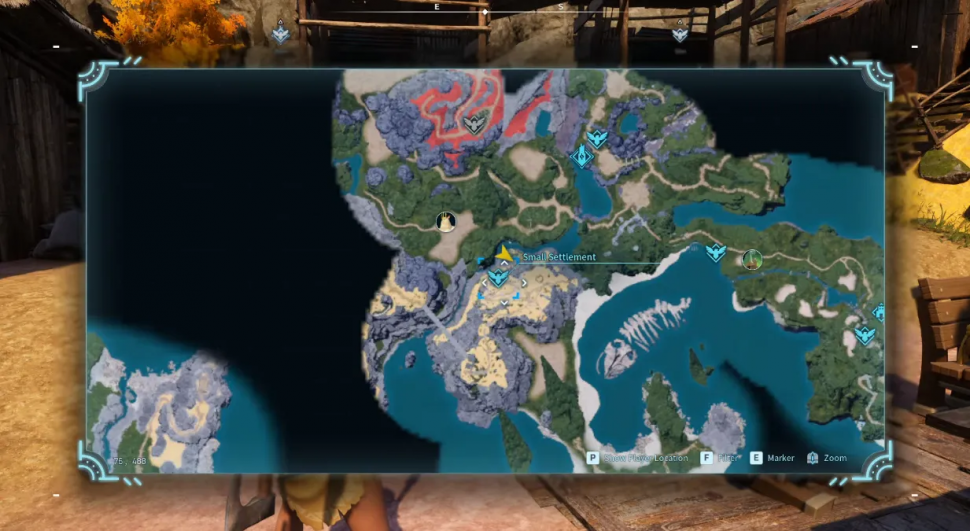Самый быстрый способ найти торговцев в Palword - отправиться в небольшое поселение, которое находится довольно близко к начальной точке игры. В левом нижнем углу карты вы можете найти координаты, основываясь на том, где находится ваша мышь/маркер, и вы сможете найти это поселение примерно по следующим координатам: 76, -488. Поселение будет находиться на вершине горы, и вы сможете добраться до него, поднявшись наверх или пройдя через близлежащий мост. Здесь показано расположение поселения на карте: