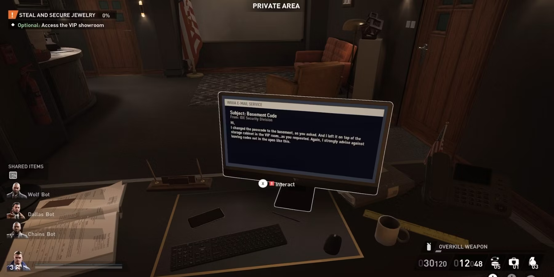 Две двери, ведущие в подвальное помещение, будут заперты на PIN-код, который будет меняться при каждой попытке ограбления. Чтобы узнать PIN-код, игроку необходимо попасть в офис менеджера и взломать компьютер, чтобы получить доступ к его электронной почте. В одном из писем будет сказано, что PIN-код был недавно изменен и теперь его можно найти где-то в окрестностях карты. Прочитайте письмо, чтобы узнать, как был придуман новый код, так как в письме будет уклончиво сказано, что PIN-код уже размещен где-то в магазине в одном из трех мест: