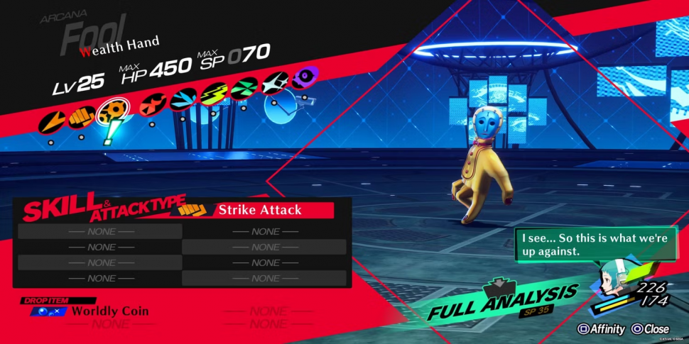 Победив Руку Богатства, вы получите большую сумму XP, а также редкий предмет, который можно продать за много йен. Episode Aigis продолжает правила модификатора XP из базовой игры, поэтому точное количество XP, получаемое каждым членом партии, будет зависеть от его уровня по сравнению с уровнем Тени и количества активных членов партии, хотя это всегда будет полезная сумма.