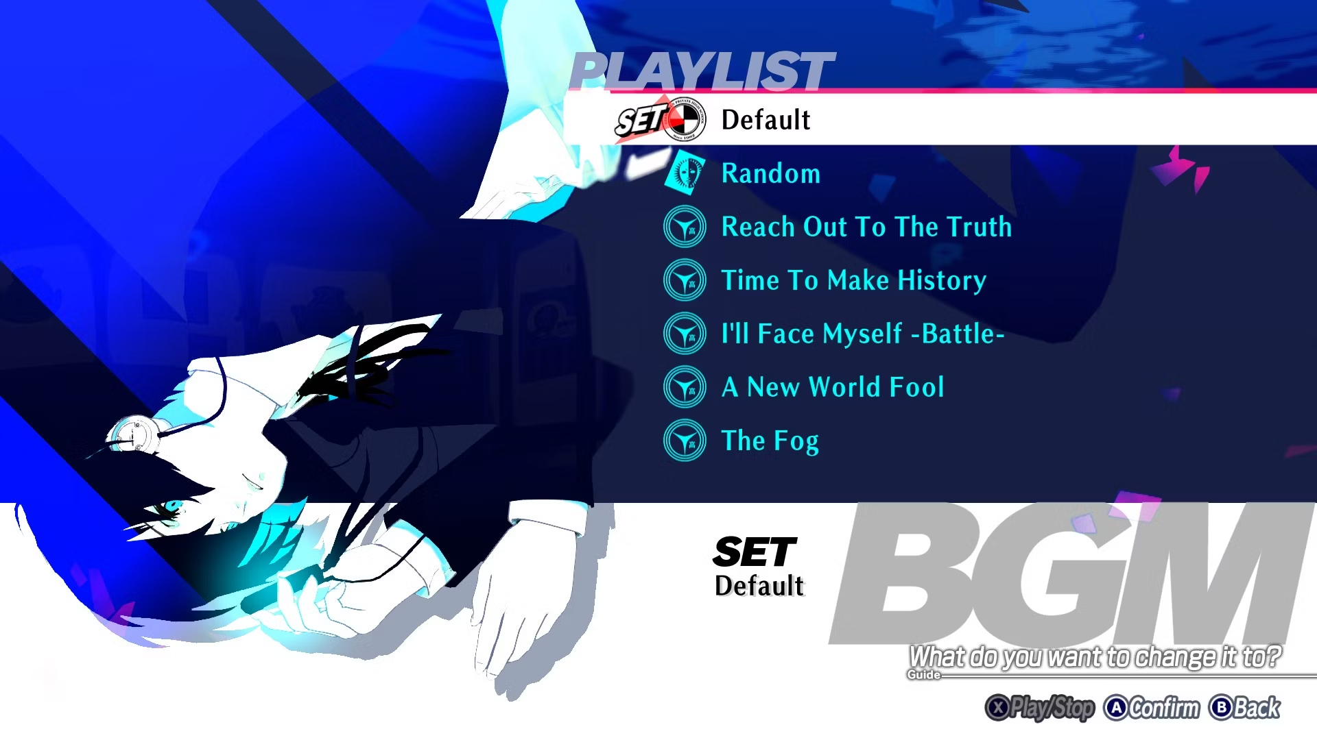 Опция "По умолчанию" включает в себя все обычные боевые фонограммы Persona 3 Reload, все темы воспроизводятся во время соответствующих видов боя. Вы можете заменить их на определенную тему из Persona 4 или Persona 5, включая уникальные боевые темы вроде "A New World Fool". Вы также можете прослушать эти темы из этого меню или выбрать "Random", чтобы игра воспроизвела любую из доступных вам BGM.