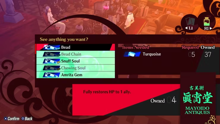 Каждый предмет в Mayoido Antiques можно купить в обмен на драгоценные камни, которые вы находили в Тартаре, причем лучшее снаряжение и предметы стоят больше редких драгоценных камней.