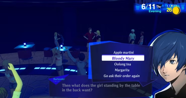 После того как вы сделаете все четыре заказа правильно, бармен отправит напиток наверх для Мутацу, и когда вы вернетесь наверх, чтобы поговорить с Мутацу во второй раз, он пригласит вас присесть, и социальная связь Tower для P3R официально начнется.