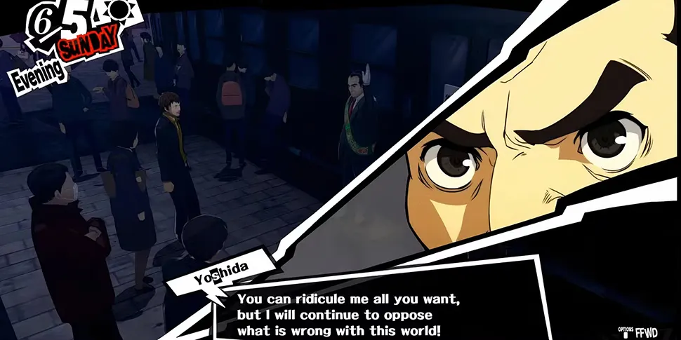 Интересная деталь — Ёсида осознаёт, как сильно его репутация мешает его работе. Он не ожидает, что его слова повлияют на массы, но всё равно продолжает свои выступления в надежде пробудить интерес хотя бы у одного человека. Именно эта честность и самоотверженность привлекает протагониста, который начинает помогать Ёсиде во время его выступлений.