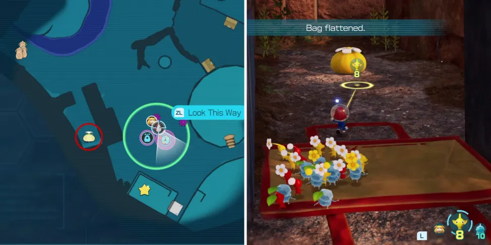 Отсюда игрокам следует искать близлежащий мешок, который можно раздавить, используя десять или более пикминов. За этим мешком находится первый из двух желтых луковиц (вторая находится в зоне "Цветущая Аркадия"), и если отнести его на базу, то он сольется с имеющейся у игрока луковицей, что позволит игроку вырастить своего собственного желтого пикмина. Помимо того, что желтые пикмины невосприимчивы к электричеству и могут разрушать электрические ворота, они также являются отличными землекопами и легче других видов пикминов. Воспользовавшись этим, игроки могут подбрасывать их выше, чем красных или синих пикминов, что позволяет им добираться до сокровищ и мест, которые иначе были бы недоступны.