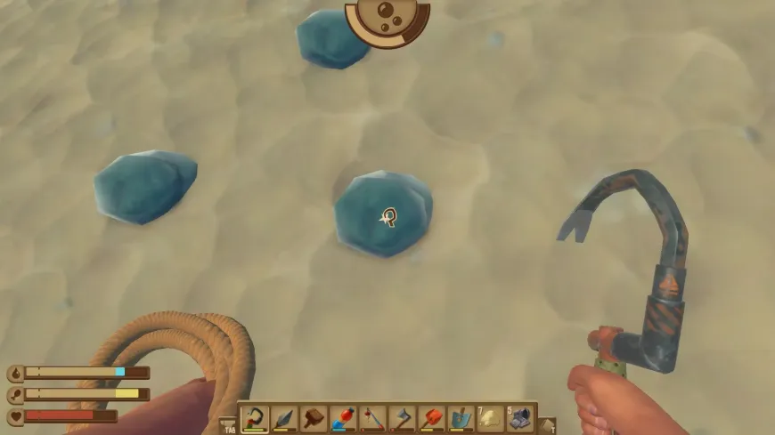 Чтобы добыть большинство этих материалов, игрокам придется использовать свои крюки. Если над водой крюк позволяет игрокам захватывать обломки, то под водой крюк становится клином, с помощью которого можно отталкивать материалы от морского дна. Игроки могут определить, когда им нужен крюк, потому что на экране появится символ в виде крюка, когда они приблизятся к материалу, которому он нужен, и им нужно будет удерживать кнопку действия, пока он не освободится.