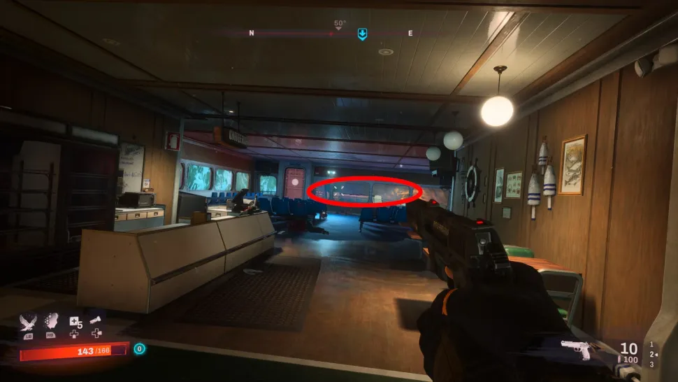 Игроки, которые ищут ключ от паромной палубы, должны отправиться на смотровую палубу корабля. Для полной ясности, это большая зона, в которой находится кафе-бар, и по прибытии игрокам следует направиться в зону отдыха на дальнем конце палубы. Здесь игроки должны использовать атаку ближнего боя или пули, чтобы разбить большие окна и попасть на внешнюю палубу.