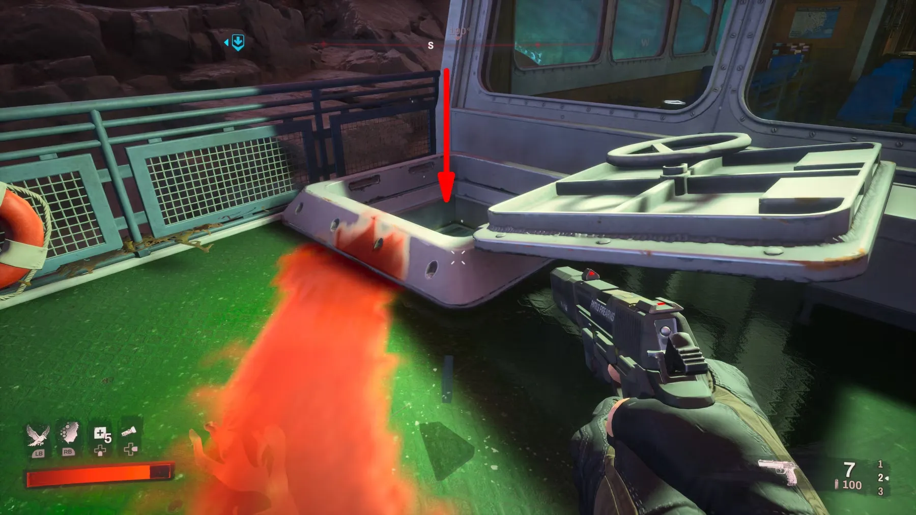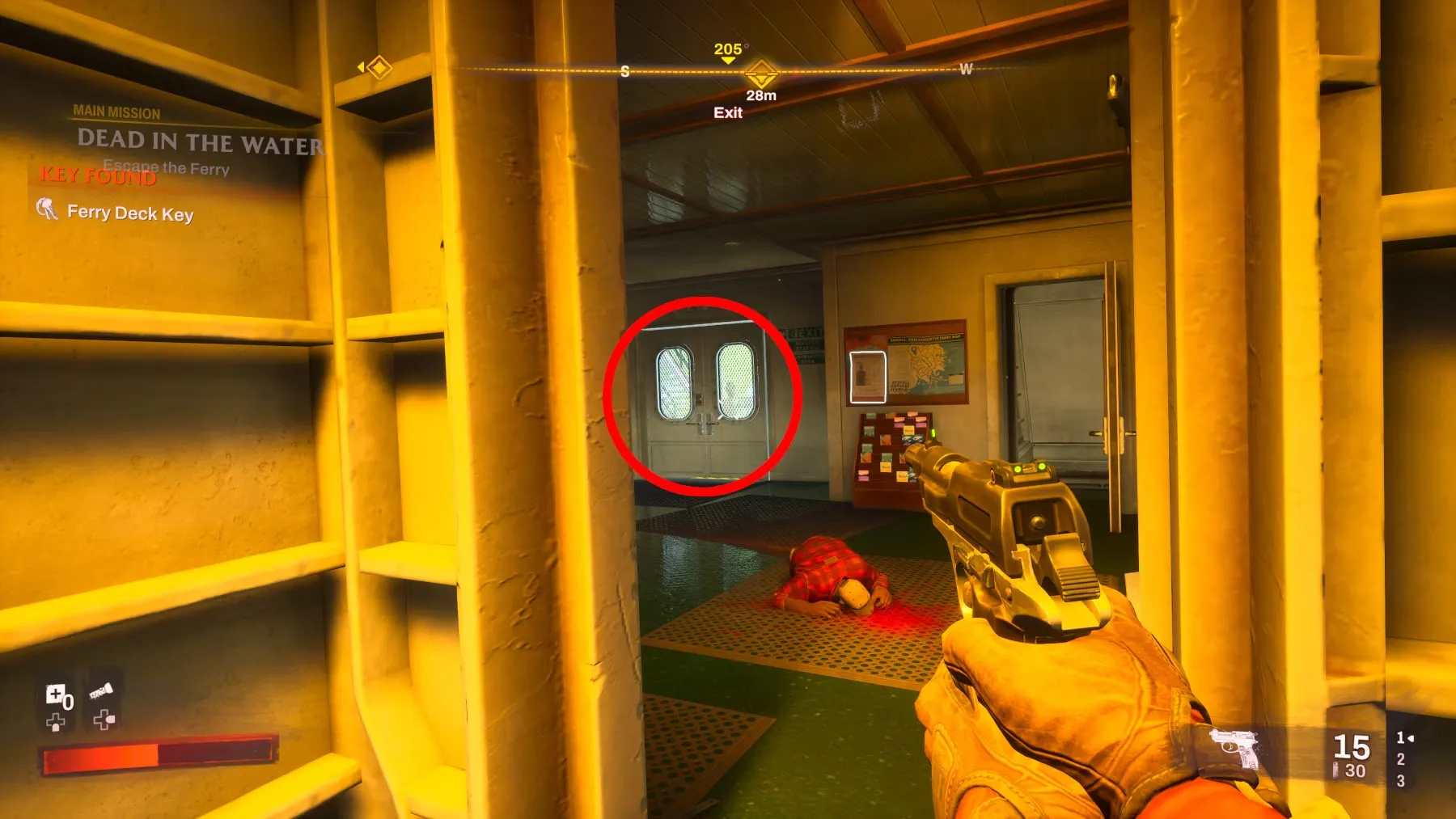 Игроки, которые ищут ключ от паромной палубы, должны отправиться на смотровую палубу корабля. Для полной ясности, это большая зона, в которой находится кафе-бар, и по прибытии игрокам следует направиться в зону отдыха на дальнем конце палубы. Здесь игроки должны использовать атаку ближнего боя или пули, чтобы разбить большие окна и попасть на внешнюю палубу.