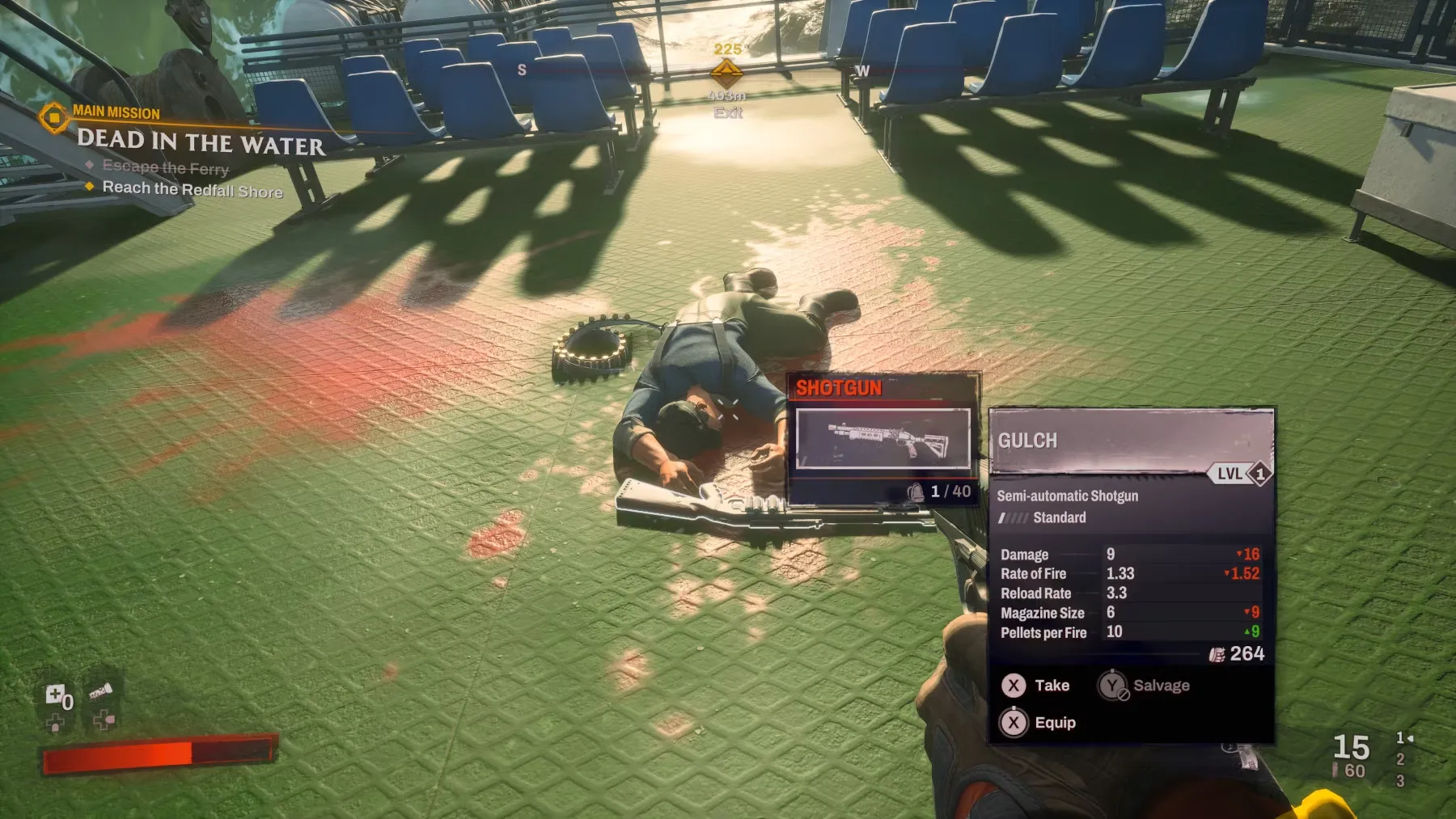 С ключом в руках игроки должны выйти из небольшой комнаты и воспользоваться лестницей слева, чтобы подняться обратно на смотровую палубу. Достигнув вершины лестницы, игроки должны пройти вперед и наткнуться на двойную дверь, которую можно открыть ключом от палубы. Затем игрокам следует пройти на палубу и забрать лежащий на земле дробовик, после чего можно отправиться в открытый мир Redfall.