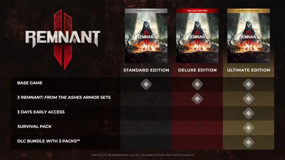 - DLC Bundle с 3 паками: Конкретные подробности о DLC для Remnant 2 пока не раскрываются, однако подтверждено, что в него войдут "новые сюжетные элементы, существа и окружение". Разработчик также сообщил, что все DLC будут выпущены в течение одного года после выхода игры.
