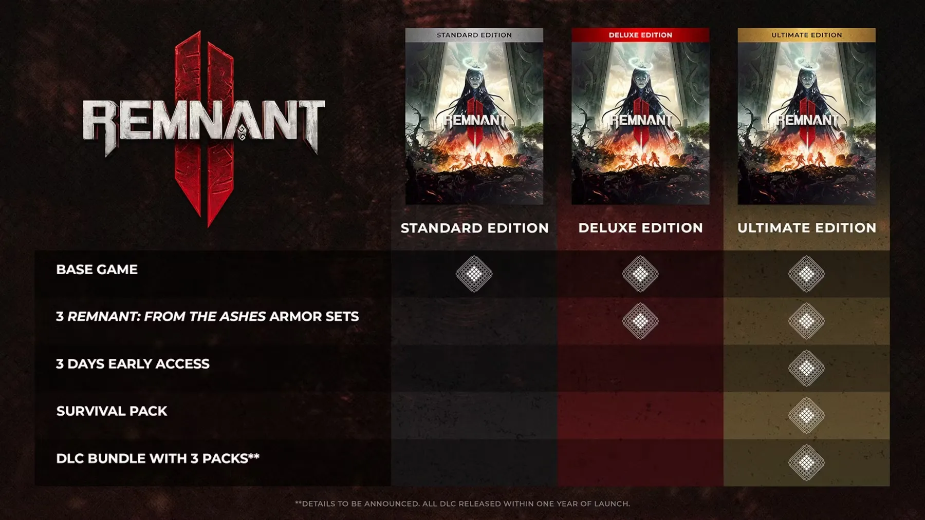 Что касается выбора между Standard и Ultimate Edition, то в первую очередь следует обратить внимание на ранний доступ и DLC-бандл. Действительно, фанаты, которые хотят начать играть как можно скорее и которым понравились DLC Remnant: "From the Ashes", возможно, захотят приобрести Ultimate Edition, в то время как игрокам, не уверенным в своей приверженности игре, лучше выбрать Standard Edition.