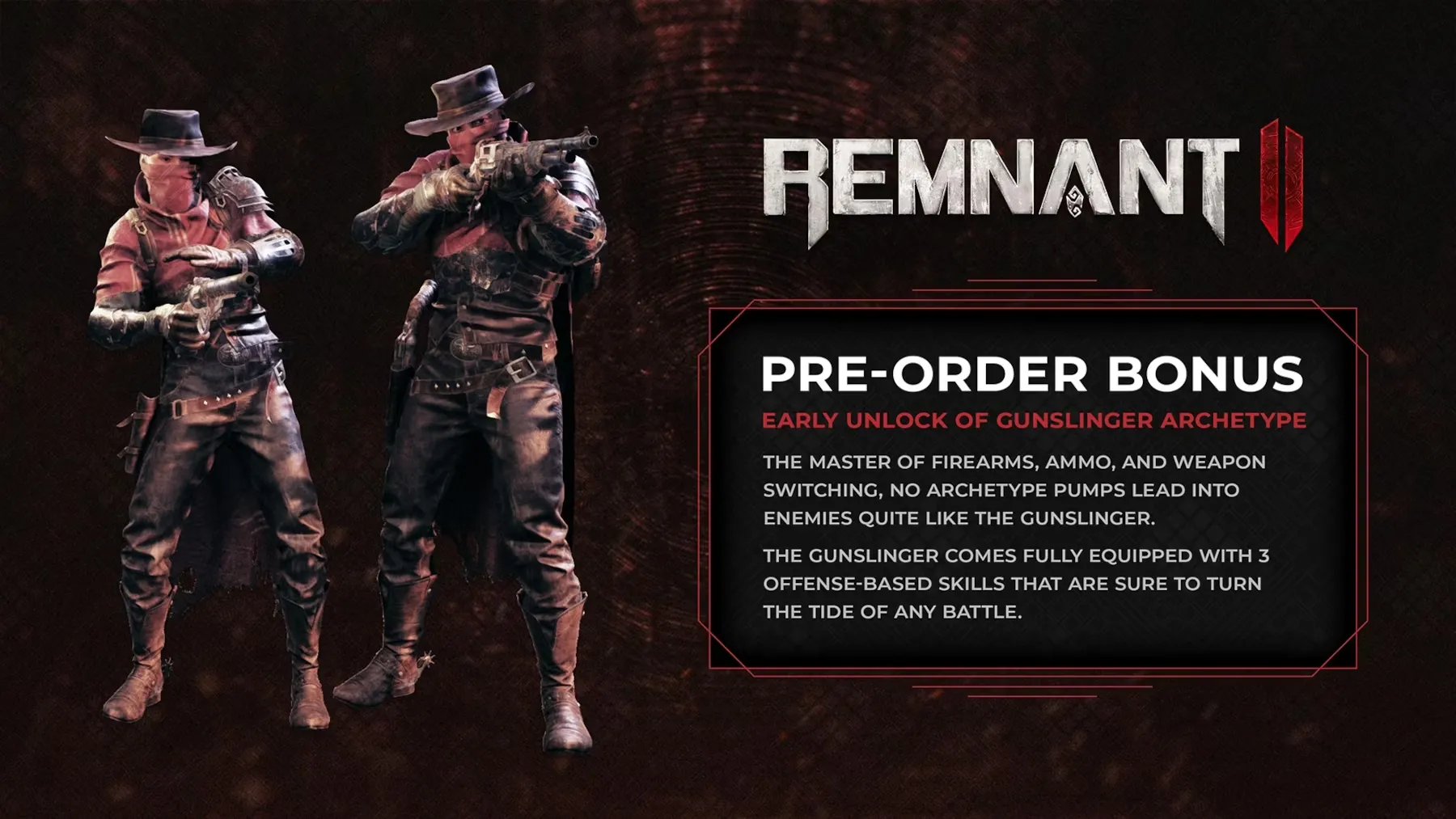Независимо от того, какое издание приобретет игрок, все, кто оформит предварительный заказ, получат "ранний доступ" к архетипу Gunslinger в Remnant 2. Тем, кто не заинтересован в предварительной покупке игры, не стоит беспокоиться, так как они смогут разблокировать этот класс, ориентированный на DPS, в ходе стандартного игрового процесса.