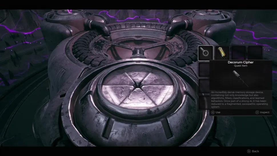 Одна взаимодействующая точка на устройстве означает, что в текущем броске N'Erud доступен либо Decorum Cipher, либо Memory Core II. В этом случае игроки могут вставить в устройство одинокий квестовый предмет, чтобы получить доступ к амулету Core Booster, хотя этот предмет можно получить и во время сбора Импульсной винтовки в подходящем мире.