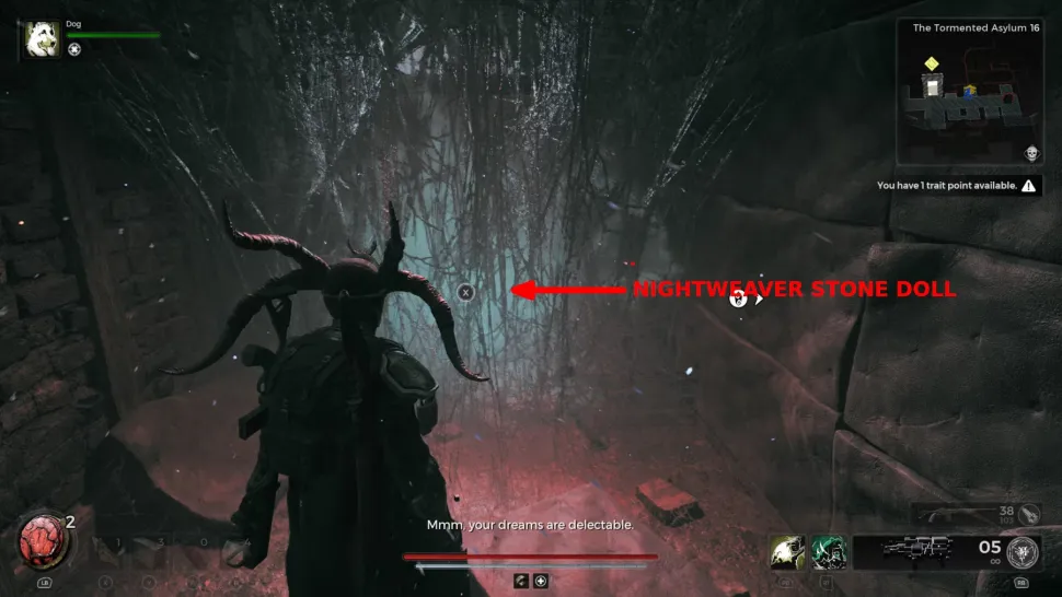 Недалеко от контрольной точки в Убежище мучителей есть несколько камер, внутри одной из которых находится большая паутина. При взаимодействии с этой паутиной появится меню квестовых предметов, и игроки, выбравшие в качестве предмета каменную куклу "Ночной ткач", сразу же получат Ловец снов.