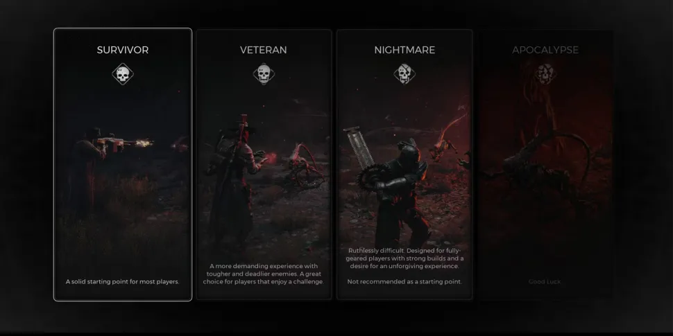 Если говорить максимально просто, то Remnant II имеет четыре варианта сложности, три из которых доступны по умолчанию, а самый сложный вариант (Apocalypse) открывается только после прохождения игры на любой сложности. Каждый из этих вариантов сложности дает бонусный опыт за убийство (хотя общий лут, скорее всего, останется прежним), но взамен мобы и боссы становятся сложнее.