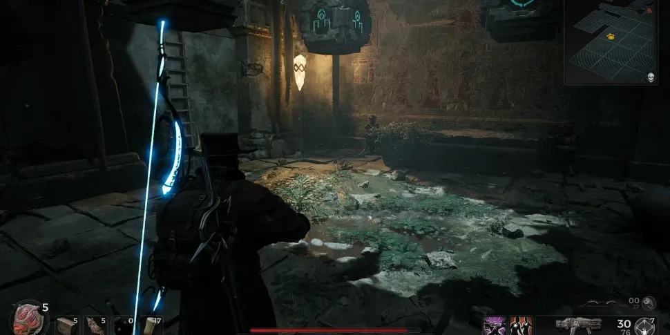 Входя в каждую новую комнату, старайтесь перекатываться через пороги, чтобы не быть раздавленным и не попасть под стрелы-ловушки, и постарайтесь зайти во все комнаты. В одной из них находится топор Крелла, который можно метать с помощью молнии, а в другой - зомби с корнем Аберранта, из которого выпадают кристаллы испорченного люменита и мутатор "Клинок вампира".