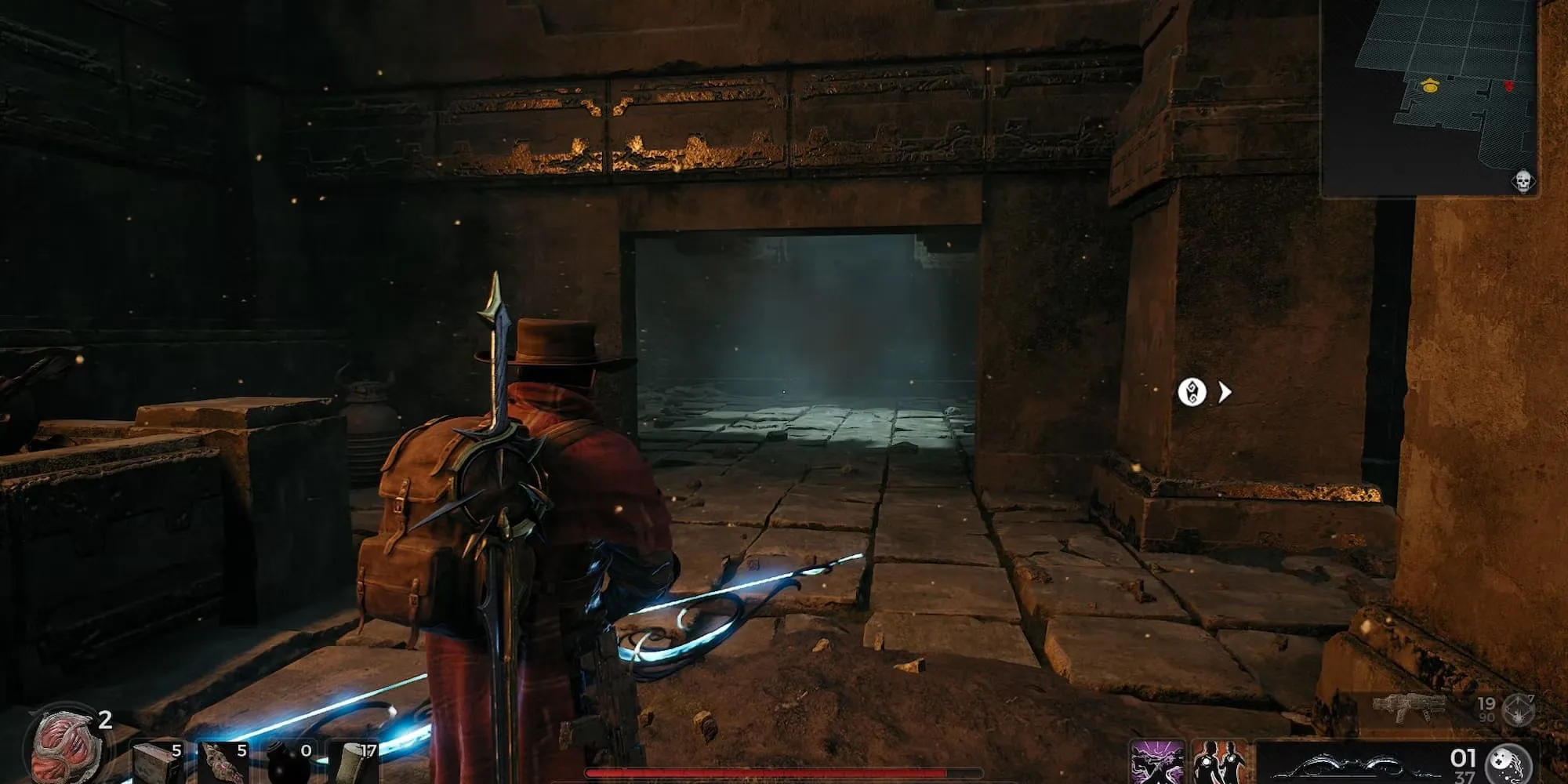 Входя в каждую новую комнату, старайтесь перекатываться через пороги, чтобы не быть раздавленным и не попасть под стрелы-ловушки, и постарайтесь зайти во все комнаты. В одной из них находится топор Крелла, который можно метать с помощью молнии, а в другой - зомби с корнем Аберранта, из которого выпадают кристаллы испорченного люменита и мутатор "Клинок вампира".