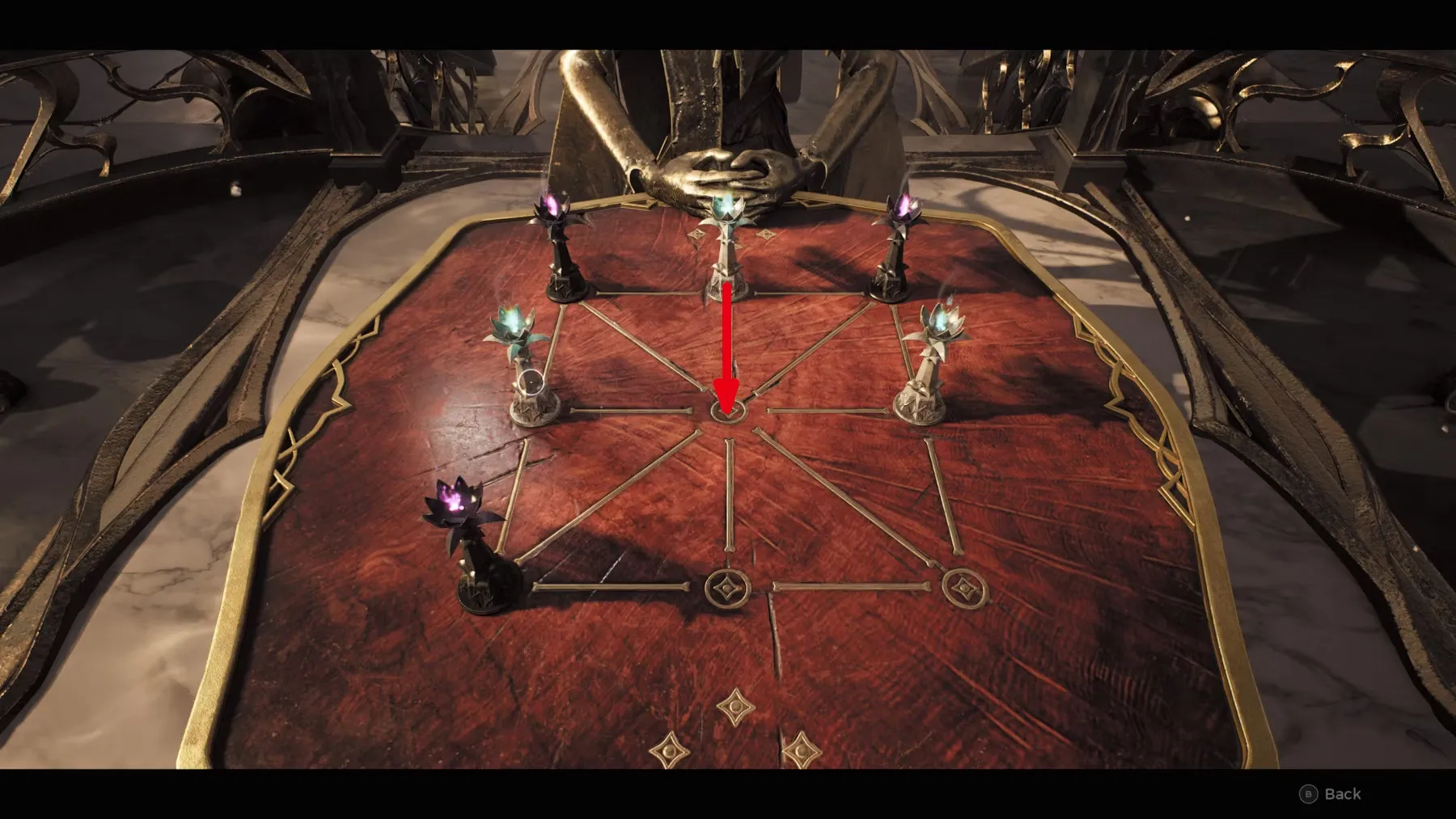 Теперь игроки должны понимать, что цель шахматной головоломки зала постуланта - выстроить линию из белых фигур, не давая противнику выстроить линию из черных фигур. Ниже приведен один из способов, с помощью которого игроки могут достичь этого результата, и, решив его, они завершат подземелье и получат доступ к комнате с Королевским охотничьим луком: