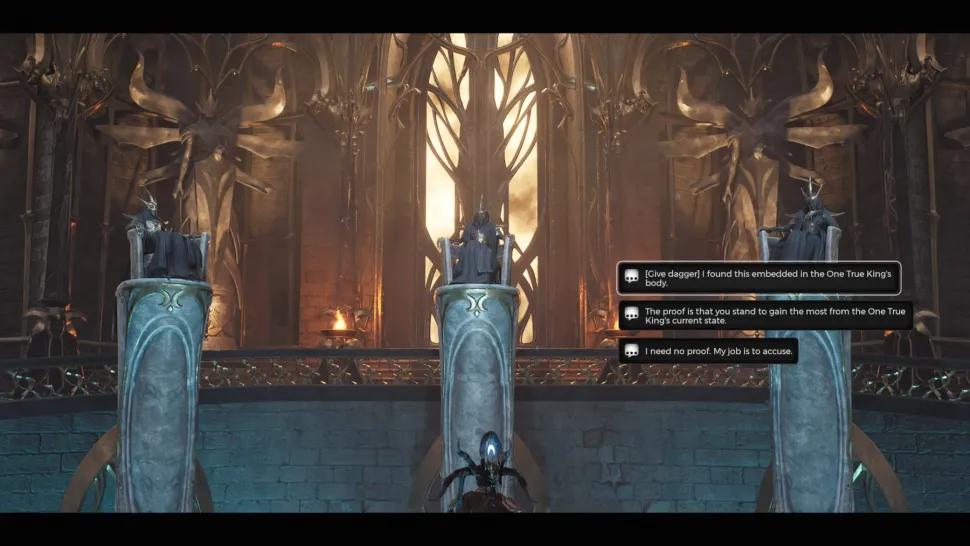 Как только игрок положит последний ключ, откроется большая дверь за сиденьями, и через нее нужно пройти к окаменевшему Королю. Игрокам предстоит взобраться по бокам этого тела и немного походить по платформе, чтобы добраться до его затылка. Затем игроки смогут извлечь из тела Истинного Короля кинжал ассасина, который послужит уликой и откроет знак виновного члена совета (его можно увидеть, осмотрев кинжал и взглянув на конец его рукояти).