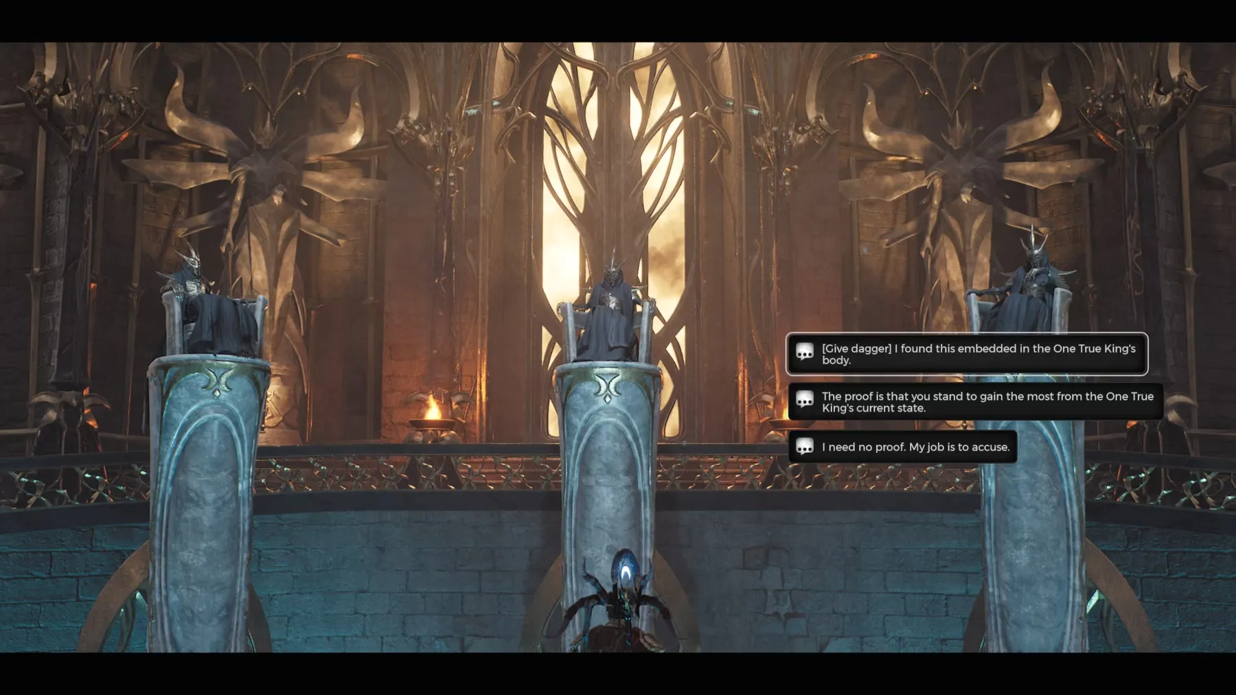 Как только игрок положит последний ключ, откроется большая дверь за сиденьями, и через нее нужно пройти к окаменевшему Королю. Игрокам предстоит взобраться по бокам этого тела и немного походить по платформе, чтобы добраться до его затылка. Затем игроки смогут извлечь из тела Истинного Короля кинжал ассасина, который послужит уликой и откроет знак виновного члена совета (его можно увидеть, осмотрев кинжал и взглянув на конец его рукояти).