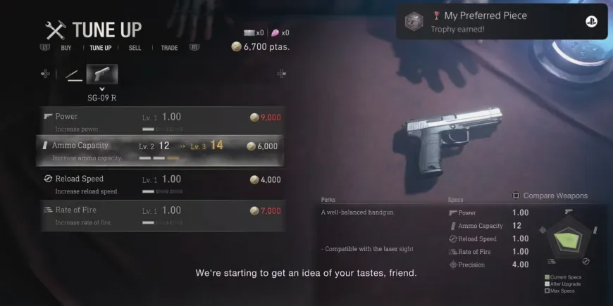 Повышение мощности оружия в меню "Настройка" при взаимодействии с торговцем позволит игроку иметь при себе еще больше патронов, чем раньше, а также откроет достижение "Моя любимая вещь". Все улучшения будут перенесены в релизную версию, поэтому игрокам следует позаботиться о том, чтобы приобрести как можно больше улучшений во время первого прохождения игры, если они хотят использовать их по максимуму в дальнейшем.