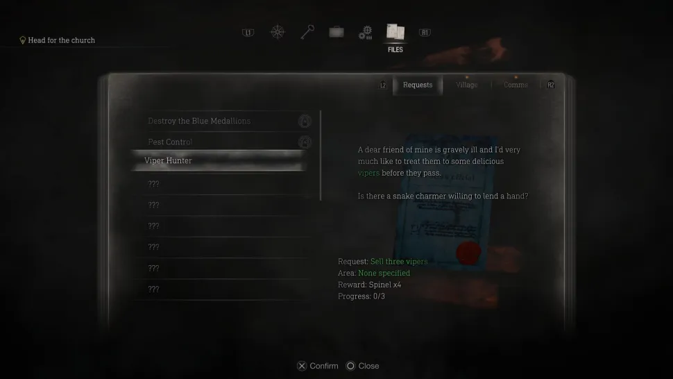 В этом задании Леону нужно обойти все окрестности и найти трех гадюк, чтобы затем продать их торговцу. Судя по всему, гадюки очень вкусные, так как человек, который хочет выполнить задание, желает скормить змей кому-то из своих знакомых, который скоро скончается. Независимо от этого, за выполнение квеста игроки получат четыре шпинели, которые можно использовать для обмена на особые предметы в магазине. Давайте рассмотрим все три места обитания гадюк в ремейке Resident Evil 4.