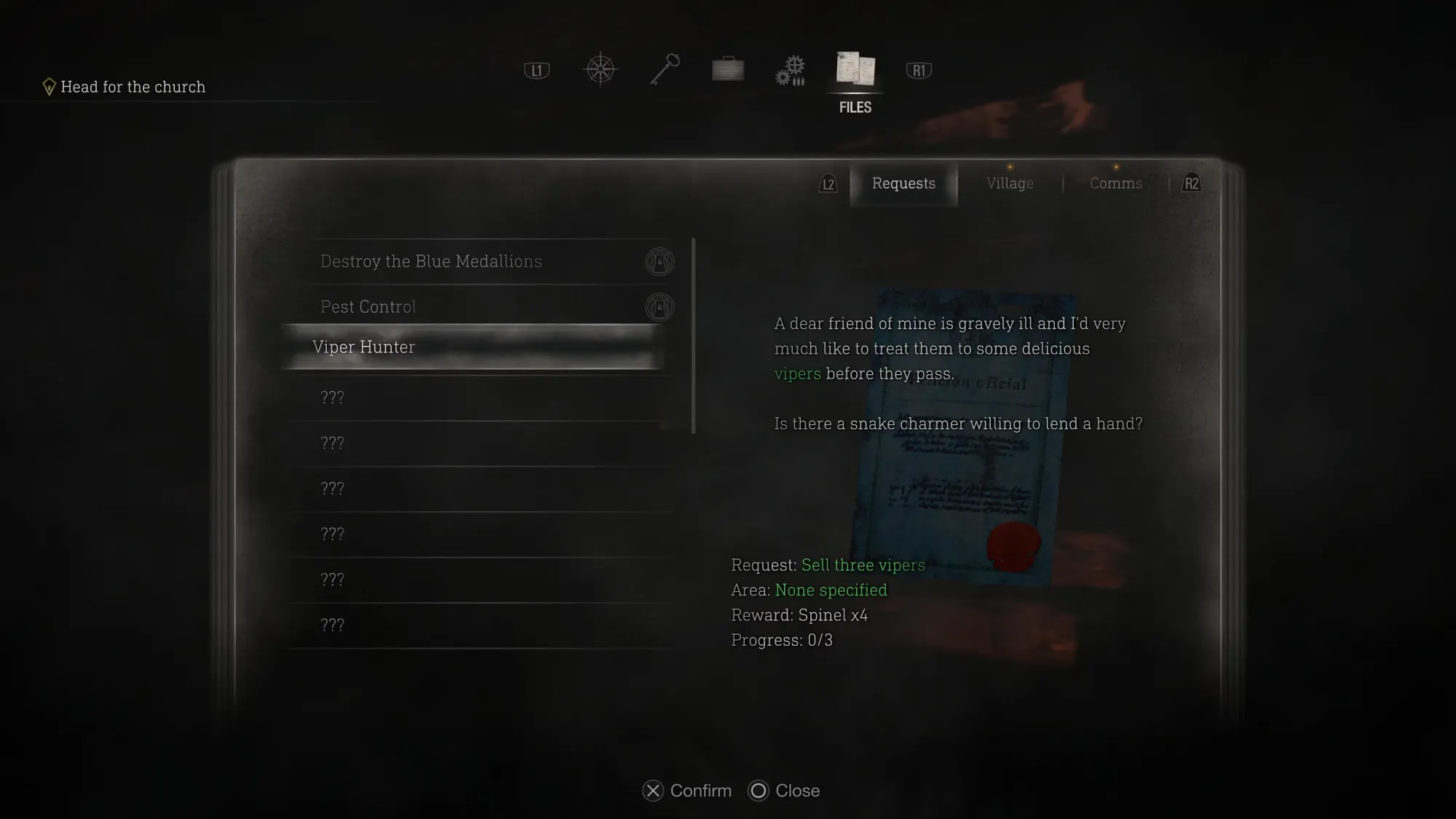 В этом задании Леону нужно обойти все окрестности и найти трех гадюк, чтобы затем продать их торговцу. Судя по всему, гадюки очень вкусные, так как человек, который хочет выполнить задание, желает скормить змей кому-то из своих знакомых, который скоро скончается. Независимо от этого, за выполнение квеста игроки получат четыре шпинели, которые можно использовать для обмена на особые предметы в магазине. Давайте рассмотрим все три места обитания гадюк в ремейке Resident Evil 4.