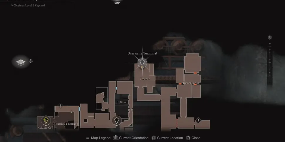 Как только питание будет включено, Леон сможет взаимодействовать с панелью управления в комнате вскрытия, чтобы разблокировать комнату прямо к северу от нее. Внутри, у самой северной стены, можно найти ключ-карту 1-го уровня.