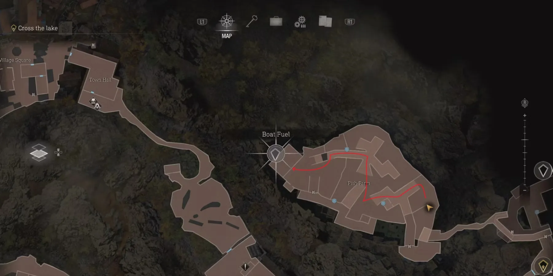 Лодочное топливо находится в дальнем западном здании на самом краю Рыбной фермы. От мелководья, на которое приземлился Леон, ему нужно пройти на северо-запад до лестницы, а затем двигаться прямо на юго-запад. Затем ему нужно будет спуститься по лестнице в воду и снова пройти на северо-запад. Поднявшись по рампе, Леон должен продолжить путь вдоль деревянной конструкции, обезвредить пищащую ловушку, пройти вперед еще несколько шагов и прыгнуть в воду слева.