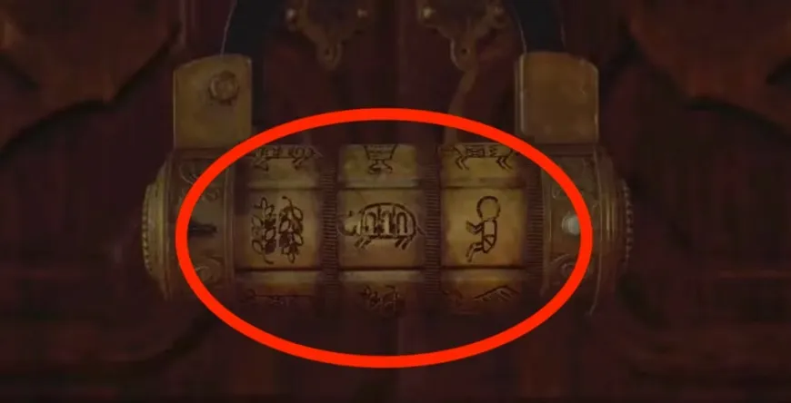 Игроки могут подойти к шкафу, чтобы приблизить навесной замок, который удерживает шкаф закрытым. Там есть ряд из трех значков, которые можно перемещать, и игрокам нужно только установить три определенных значка на место. Решение головоломки с навесным замком из Resident Evil показано на изображении ниже. Три символа слева направо: две ветки с листьями, свинья-черепаха и ребенок.