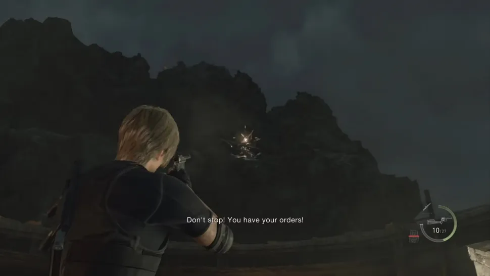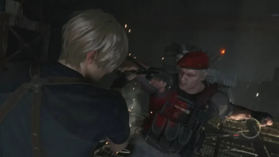 Краузер также попытается схватить Леона, и если у игрока есть запас здоровья, всегда есть возможность нажать на кнопку, чтобы спастись, а не снижать стойкость ножа. Продолжайте в том же духе, и Краузер отступит для настоящего боя в четырнадцатой главе.