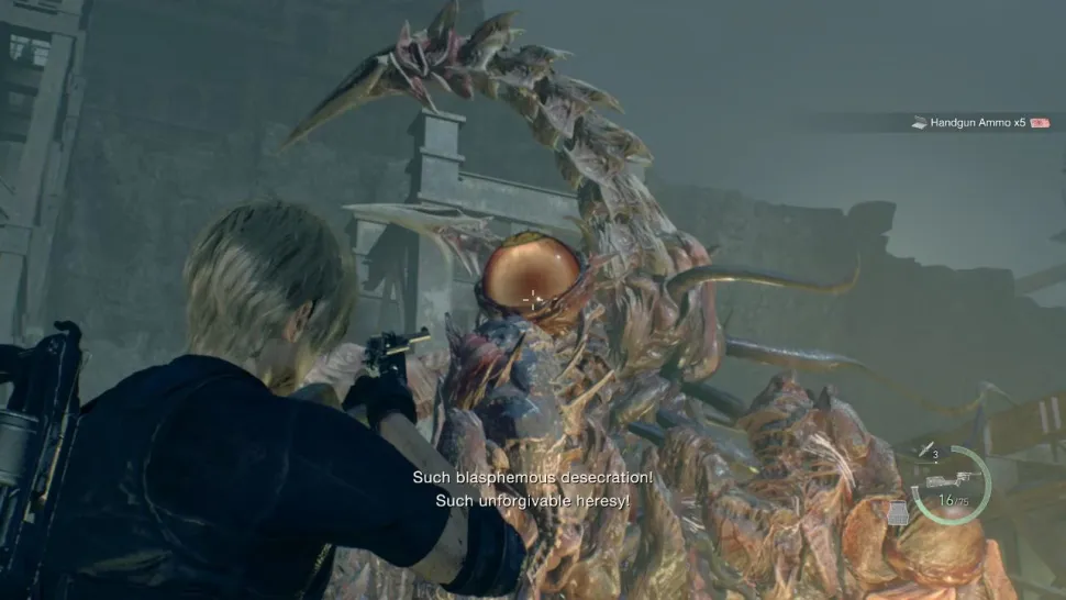 Если внимательно присмотреться к Саддлеру, его слабые места становятся очень очевидными. Есть шесть глаз, в которые игроки могут стрелять, чтобы нанести боссу большой урон, но настоящая проблема заключается в ограниченном пространстве для работы. Всегда держитесь на расстоянии от Саддлера, стреляйте в слабые места, а если он будет оглушен, подберитесь поближе, чтобы Леон смог проткнуть его в главное глазное яблоко. Хороший ручной пистолет, такой как Red9, отлично справится с этой задачей, как и дробовик, такой как Striker, если расстояние достаточно короткое. Для тех, кто не может правильно рассчитать время, когда глаза открыты, используйте SMG, например LE 5.