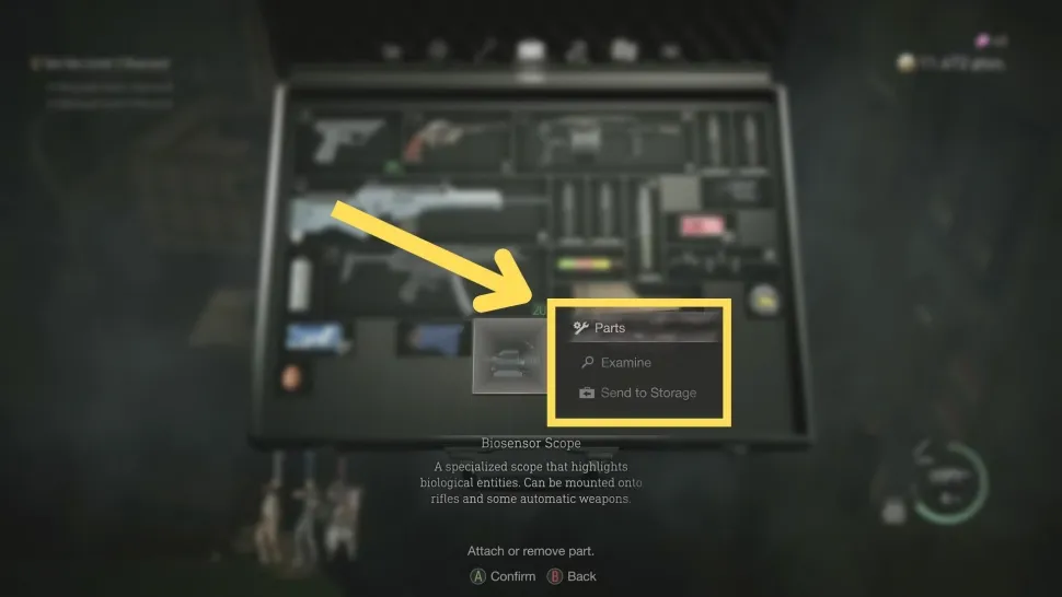 - Возьмите Биосенсорный прицел в комнате управления Лаборатории инкубации, той самой, где Леону предлагается найти гаечный ключ.