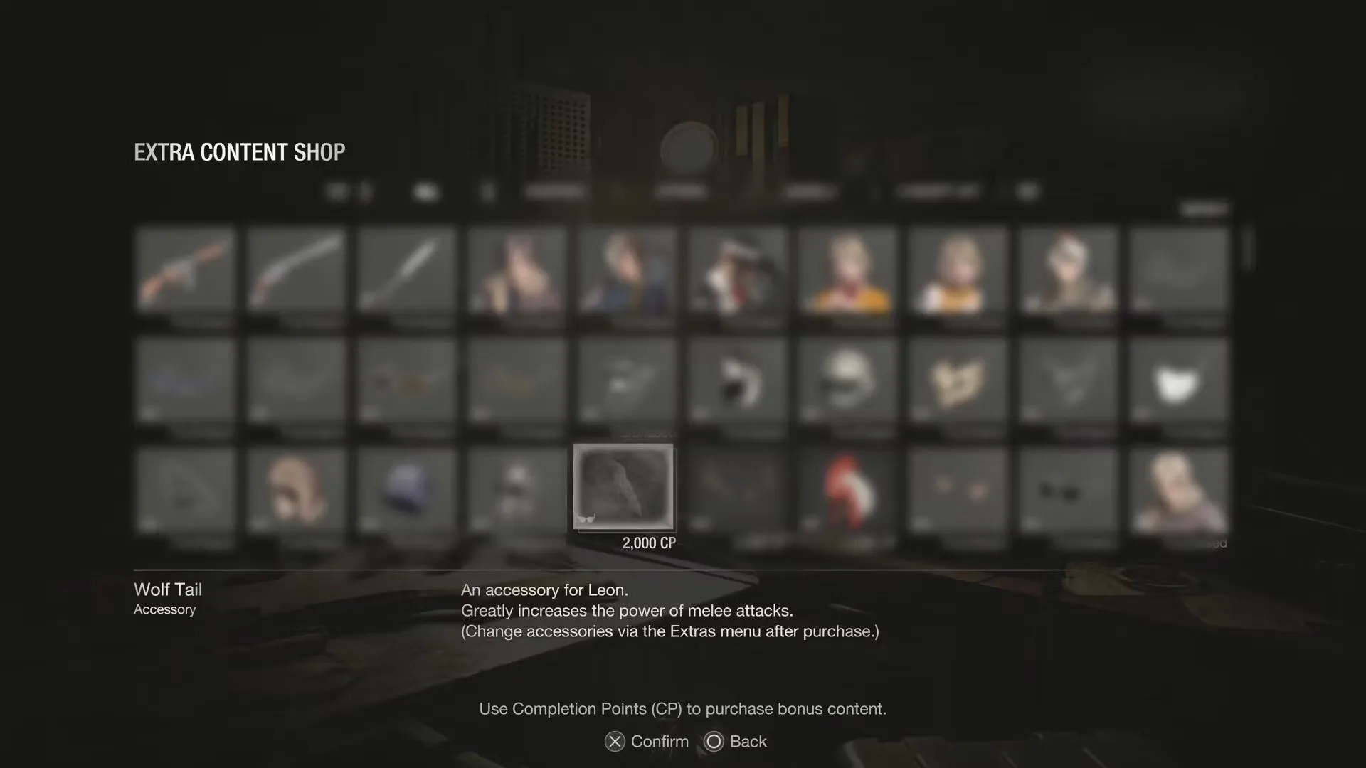 После приобретения Волчьего хвоста он становится доступен из главного меню и меню паузы. Чтобы надеть его, игрок должен перейти на вкладку Extras и включить хвост в разделе "Аксессуары Леона". (Выключить вид невозможно, и хвост будет виден на всех нарядах).