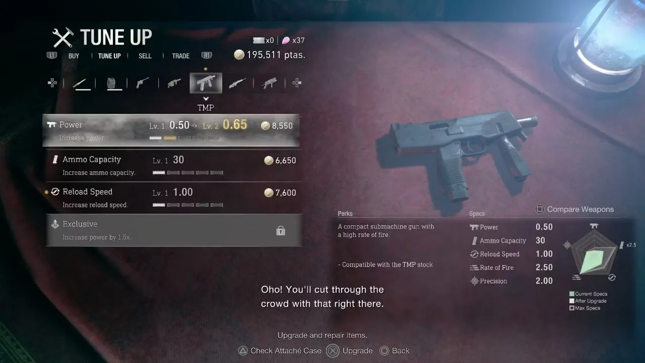 - TMP Базовый SMG, который неплохо справляется со своей задачей, можно приобрести у торговца за 10 000 песет в главе 3.