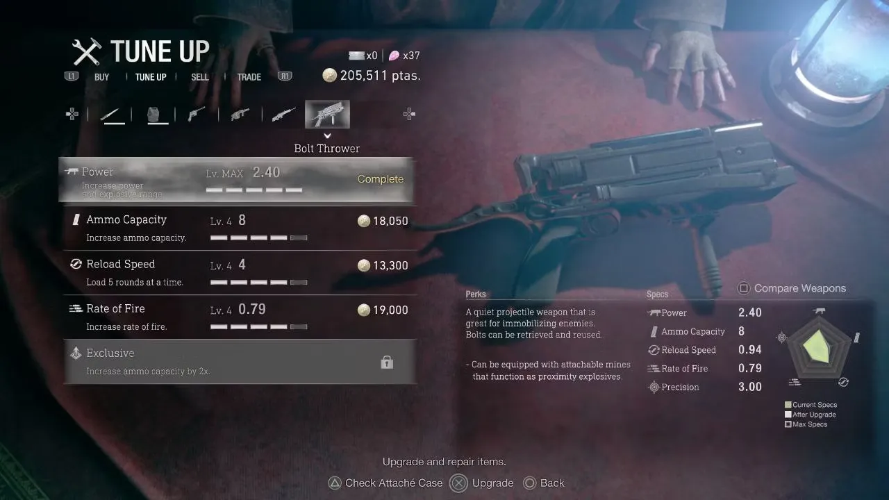 - Метатель болтов Отличное оружие скрытности, которое может быть усилено прикрепляемыми минами, метатель болтов можно приобрести у торговца за 10 000 песет во второй главе.