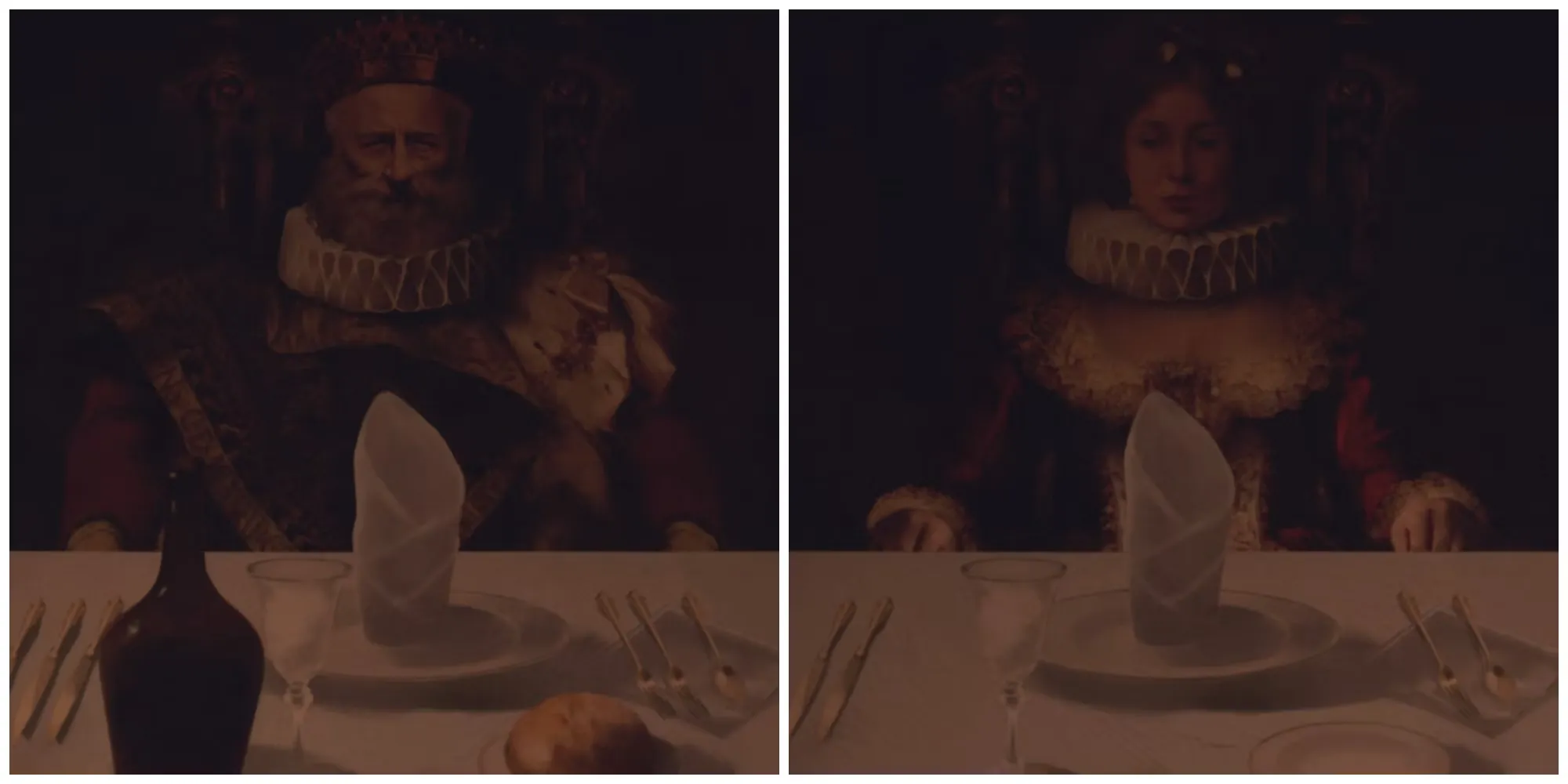 Хитрость в решении загадки столовой заключается в том, чтобы Леон сел на стул рядом с тарелкой, изображенной на портрете мужчины, а Эшли села на стул напротив тарелки, изображенной на портрете женщины.